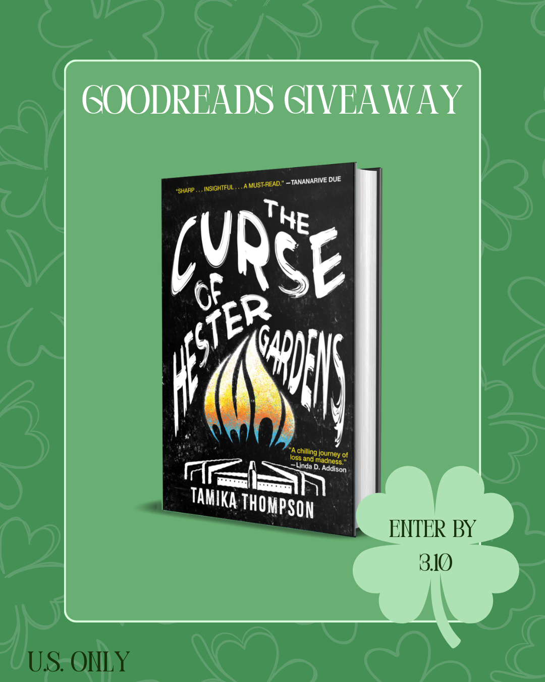From today through March 10th, Goodreads, Kensington, and I are offering 100 copies in a giveaway of the print edition of THE CURSE OF HESTER GARDENS, (open to US Entrants only).